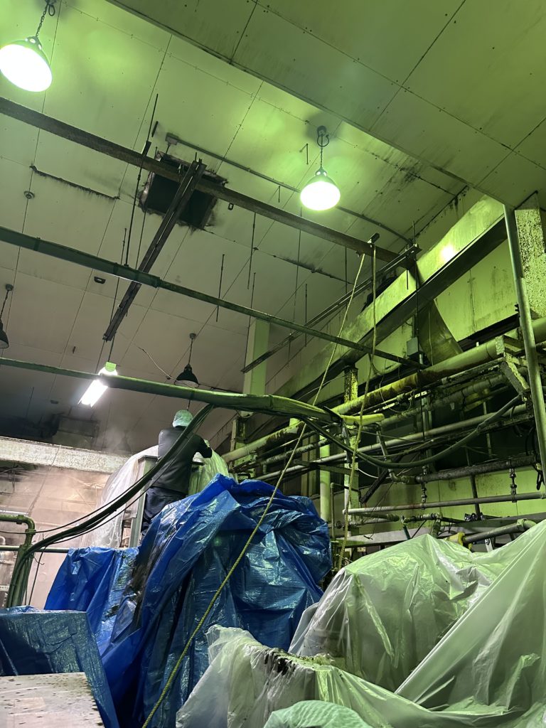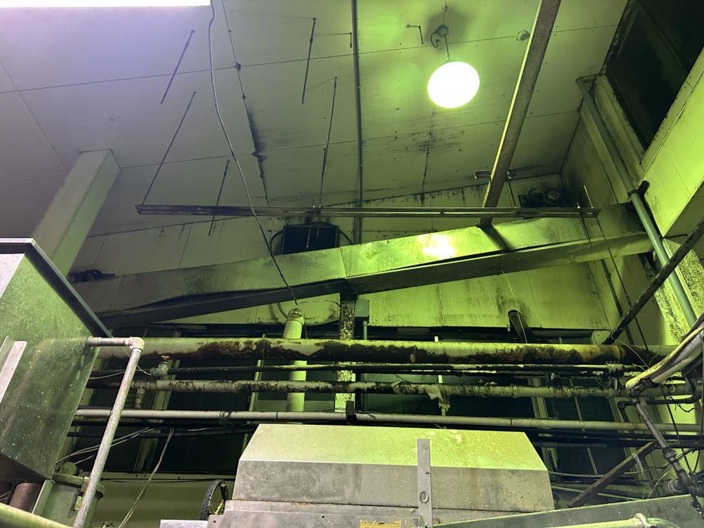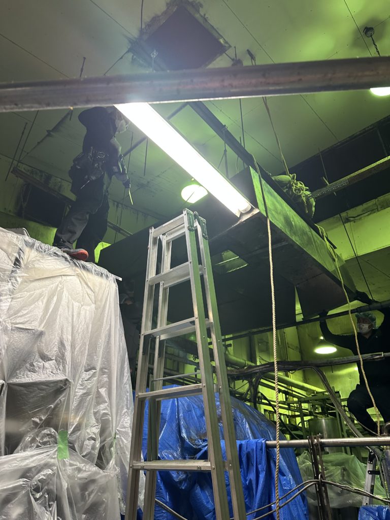 天吊しているシロッコファンを高さ6mくらいの高さで足場も悪い、下には機械が沢山置いてある場所での撤去